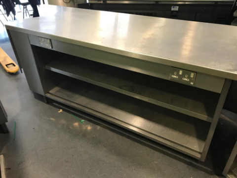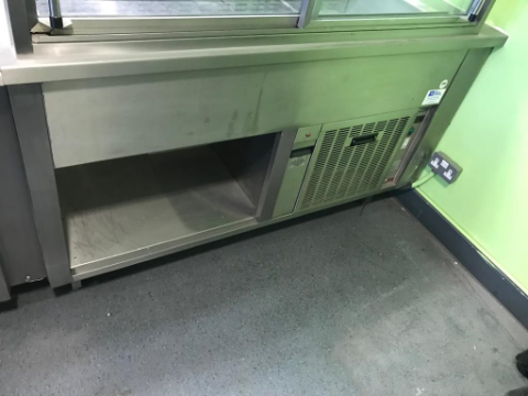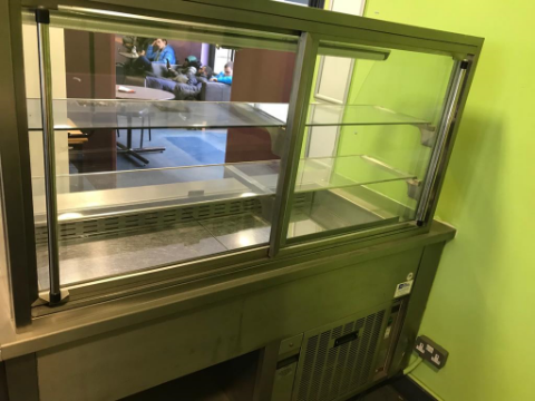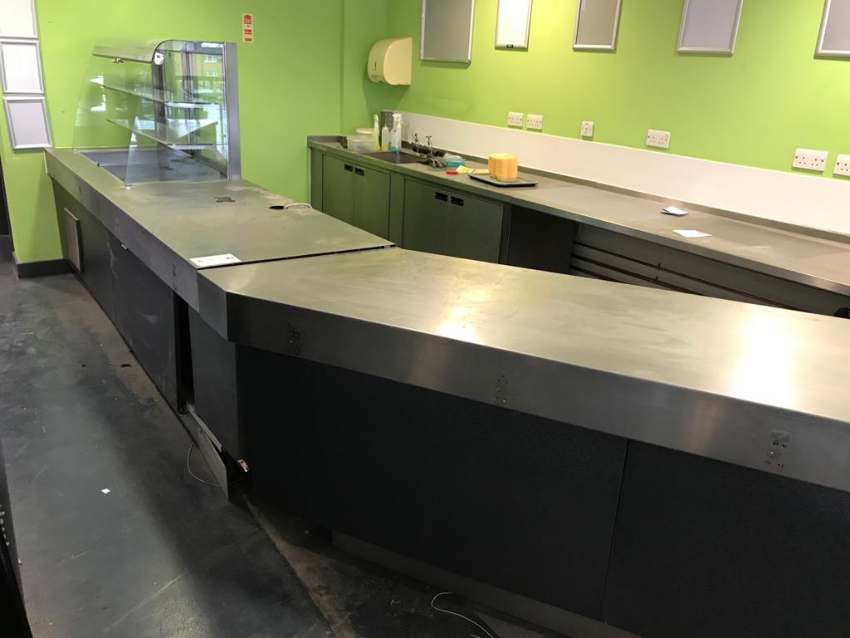 Moffat catering, corner stainless steel serving counter with open front display fridge. Model: MD15, Serial No: 17831.1.07 Approx Total length: 6.192m Height (from counter): 1.005m, Height (from glass): 1.738m