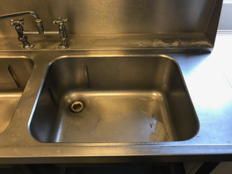 Stainless steel double sink with single movable tap, waist disposal unit and 2 soap dispensers