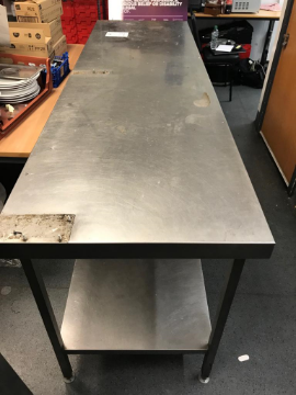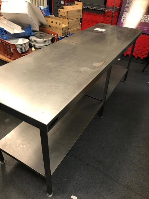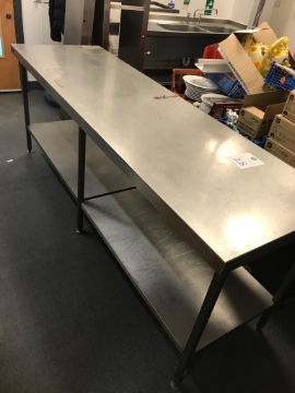 Stainless steel counter with shelf below,Approx Length: 2.418m, Depth: 0.81m Height: 1m