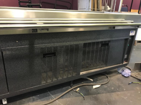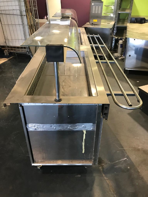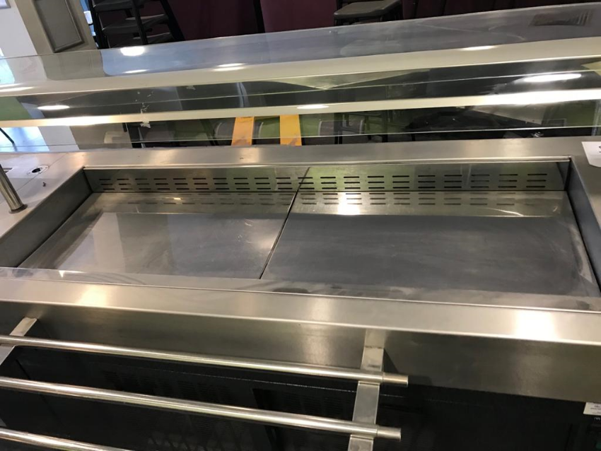 Moffat stainless steel refrigerated serving counter. Model: MRF18T + CVA/18, Serial No: 17831.1.1.07,Approx Length: 3.563m, Width: 0.91m: Height(from glass to floor): 1.338m