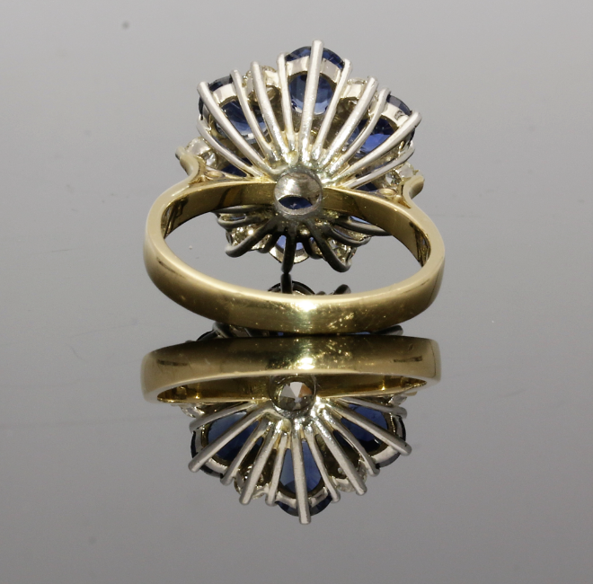 Vintage Sapphire & Diamond Cluster Ring 1950s Era/Dated: 1950s Condition: As NEW New Superb Quality Presentation Box General Description: Diamond and Sapphire cluster comprising an old cut centre diamond surrounded by 6 rich blue oval cut sapphires, also set with 6 small brilliants between the sapphire Diamond: Dimensions: Centre stone - 5.35mm x 3.26mm Carat weight: .60cts 6 x Sapphires: Dimensions: 6.15mm x 4.22mm. Total carat weight approximately 3.70cts Finger Size O 1/4 (UK) / 7 1/4 (USA) / 56 (EURO) This ring can be adjusted 3 UK sizes up or down free of charge. Please enquire for cost of alteration outside this size range Weight 7.8 grams Stamped 18C Plat