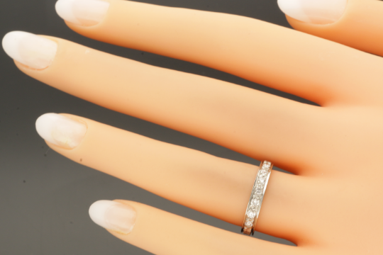 French Vintage Full Diamond Wedding / Eternity Ring Era/Dated: 20th century Condition: Excellent Original Condition Diamond Dimensions: 20 diamonds 2.10mm diameter each. Carat weight: .75cts Width: 3.30mm Ring Size K 1/2 (UK) / 5 1/2 (USA) / 51 1/4 (EURO) This ring cannot be sized. Weight 2.8 grams Tested Gold 18ct. French marks for 18ct gold