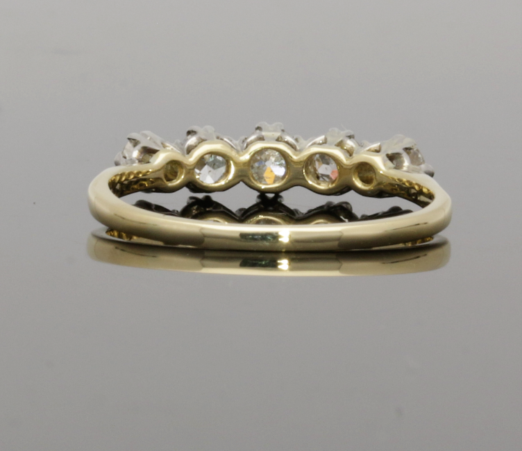 Vintage 1920s/30s 18ct Yellow Gold 5 Stone Graduated Diamond Ring Era/Dated: 1920/1930s Condition: Excellent Original Condition Diamond Dimensions: Largest Stone 3.65mm diameter / Smaller Stones 3.2mm diameter each. Overall width: 18.6mm Carat Weight .66cts Ring Size Q (UK) / 8 (USA) / 58 (EURO) Ring Size can be adjusted 3 UK Sizes up or down free of charge For sizes outside of this please enquire Weight: 2.4 grams Stamped 18CT PLAT New Presentation Box