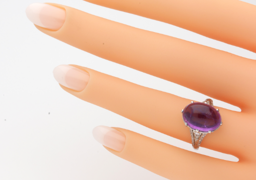 18ct White Gold Amethyst & Diamond Ring 20th Century General Description: A gorgeous statement Amethyst. Imposing cabochon domed cut with 28 small graduated diamonds set into the shoulders and also another 12 small diamonds set in the under bezel. The under bezel also features intricate filligree work which is all in perfect condition. Virtually as new. Amethyst: 14.5mm x 9.8mm x 7.6mm Estimated to be 7.75cts Diamonds: 40 Diamonds Total diamond carat weight approx: 0.50cts Finger Size K 1/2 (UK) 5 1/2 (USA) 51 (Euro) This ring can be adjusted 2 UK sizes up or down free of charge. Please enquire for cost of alteration outside this size range Weight 3.2 grams STAMPED 18CT