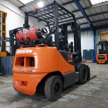 LPG ForkliftMake: DoosanModel: G25P-5Capacity: 2,500kgYear: 2010Hours: 5,701Lift height: 4,730mm (Triplex mast)Low closed height at 2,140mm