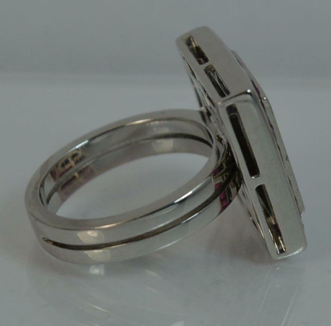 Art Deco Design, Modern Cluster Ring, Solid and very heavy 18 carat white gold, The 20mm x 20mm cluster head, protruding 6mm off the finger, The head is set with thirty six round brilliant cut VS clarity natural diamonds to total approx 1.00 carats. Surrounding is a border of 27 princess cut natural ruby stones, WEIGHT ; 15.3 grams, SIZE ; R UK, 8 3/4 US