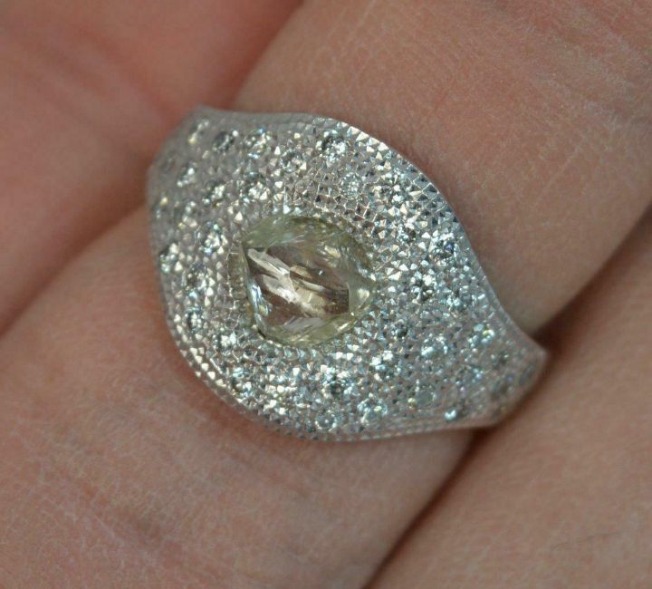 De Beers Designer Ring, Known as a Talisman Ring, 18 carat white gold throughout, To the centre is a rough un cut diamond, 5.3mm x 5.8mm approx, Over 1 carat of diamond in total, 12.2mm wide band to front, WEIGHT ; 6.3 grams, SIZE ; H 1/2 UK, 4 US