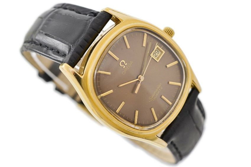 Omega Seamaster Quartz Gold Plated Mens Watch, Year – 1979 - 1982, Dimensions – 35mm X 42mm, The dial is almost like a gunmetal colour, with gold markers, date at 3 o' clock, all under an acrylic crystal which has been buffed to its looking perfect, the Omega logo still evident in the centre. The crown is a push button version, it looks slightly worn, but works as it should, push down, hold, release, and quickly push again and hold to adjust the time. will fit a wrist of about 7.5'' or 19cm approximately.