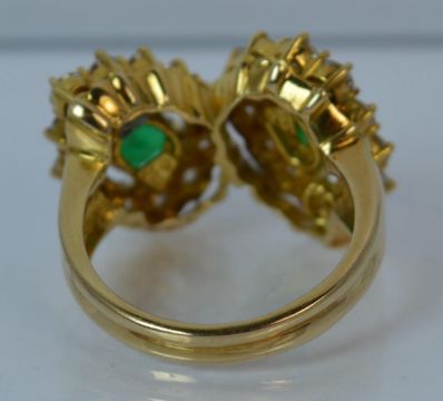Emerald and Diamond cluster ring, Set with two natural oval cut natural emerald to measuring 6.0mm x 7.6mm. Surrounding the emeralds are 12 round brilliant cut diamonds to form two pear shaped clusters. WEIGHT ; 10.2 grams, SIZE ; P UK, 7 3/4 US.