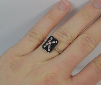 Art Deco Period Signet or Panel Ring, Solid platinum shank and head, Set with alternating natural rubies and diamonds, all old cuts, in the form of an initial K. 9.5mm x 13.5mm head. Weight; 4.6 grams, Ring Size; O UK, 7 US