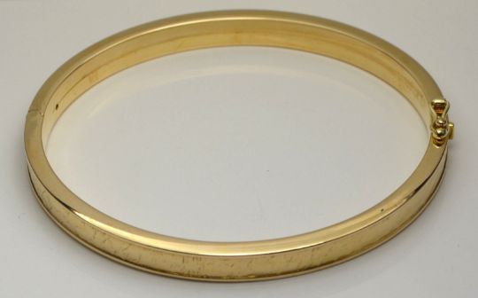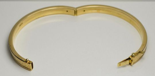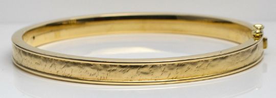 9ct Yellow Gold Patterned Hinged Bangle / Bracelet 7.5", Measurements- 7.5 inches (length, approx), 0.6 cm (width, approx), 6.8cm x 6cm (diameters), Weight- 16 grams , Hallmarks- '375' (9ct gold), 'leopard' (London), 'GS' (makers mark) , Condition- Very good