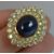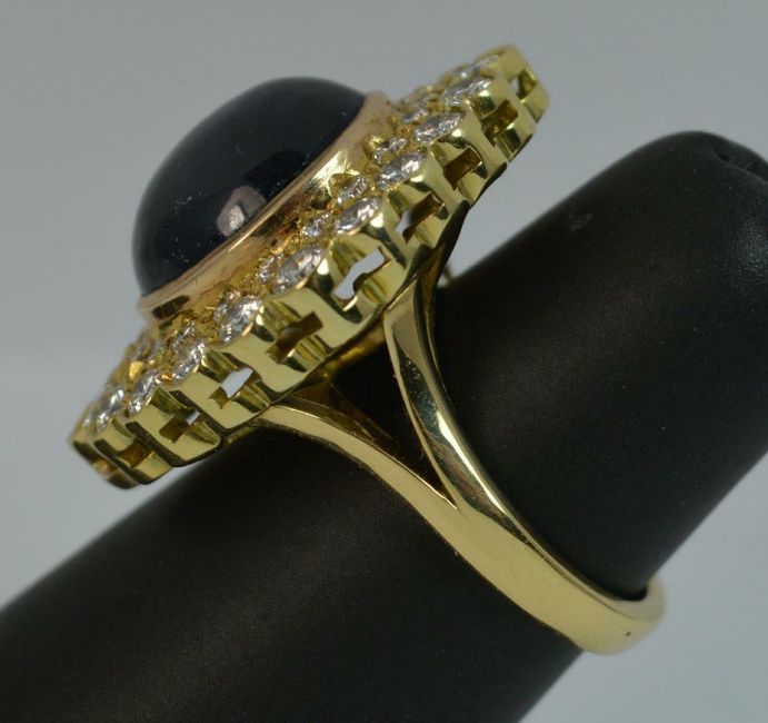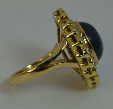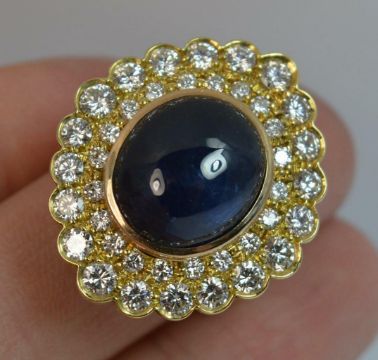 Sapphire and Diamond Cluster or cocktail Ring, 18 carat yellow gold, Designed with a large oval sapphire cabochon to the centre. 12mm x 13.5mm. WEIGHT ; 15.5 grams.
