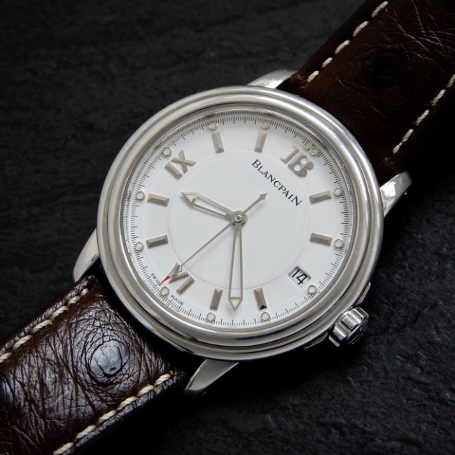 Blancpain Leman Grande Watch. Very Good Condition Dial is A1 Mint condition the case is very good with only minor wear consistent with careful use could be polished if so desired but generally very good this is a complete set with the buckle the strap is new the box shows minor signs of age. Overall VERY GOOD. Easy To Read, Dual Barrel, Frederic Piguet automatic calibre 11.51, Ultra Plat Movement, 12-Hour Dial, Large Numerals, Luminous Dial, Luminous Hands, Roman Numerals, Swiss Made, Swiss Movement. Number of Jewels: 28 Jewels