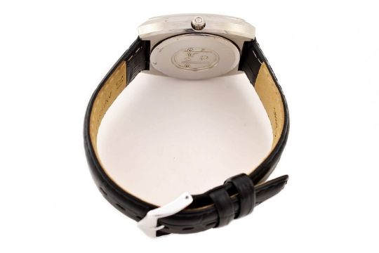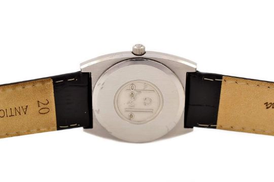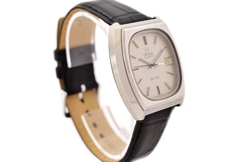 Omega De Ville Quartz Stainless Steel Midsize Unisex Watch, Age: 1980's, Stainless Steel Case Measuring Approximately 33mm X 39mm, Without Crown and from Lug to Lug, Has Scratches , Stainless Steel Omega Push Button Crown, Replacement Crystal, Omega 7 Jewels Caliber 1342 Quartz Movement, New Darlena Black Replacement Genuine Leather with Stainless Steel Buckle.