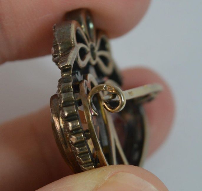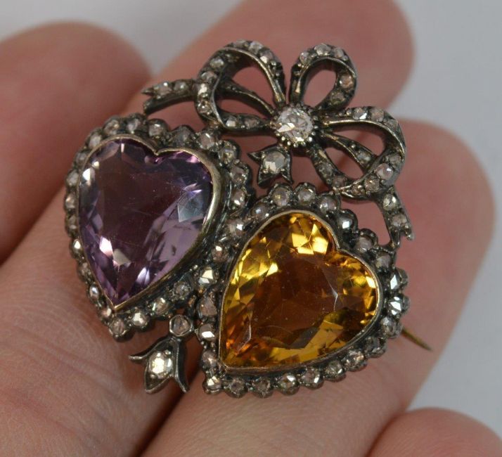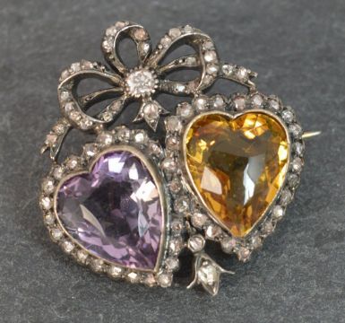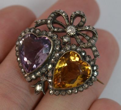 Victorian 18ct Gold Amethyst Citrine & Old Cut Diamond Two Hearts Brooch, Over 70 natural diamonds, WEIGHT ; 10.6 grams, SIZE ; 22mm x 28mm brooch, 10mm x 12mm gemstones, DATE ; c1860, HALLMARKS ; 750 to pin and French assay mark to side