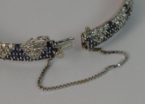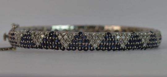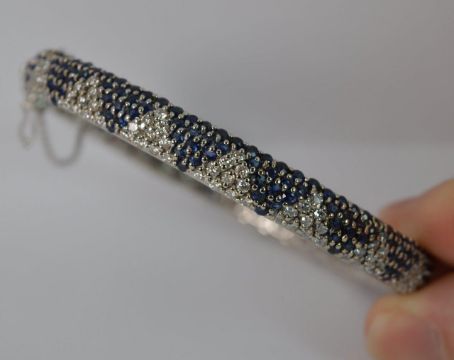 Ladies Full Eternity Bangle, Solid 18 carat white gold, Approximately 170 round cut diamonds total 3.40 carats and 255 round cut sapphires total 5.10 carat. Well made piece with double safety catches, WEIGHT ; 23.9 grams, SIZE ; 6 3/4 inch inner circumference, 7mm wide throughout, HALLMARKS ; 750, full English hallmarks to clasp.