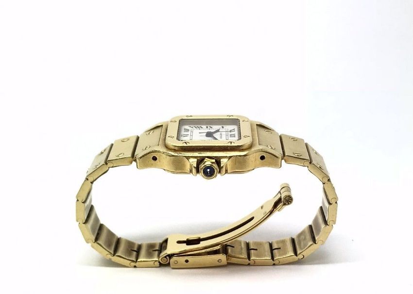 Cartier Santos 24742 White Roman 24mm dial 18k Gold Ladies Watch. Quartz battery. Solid 18k gold case and bracelet. 24 mm dial (excluding crown). Black Roman numerals. Comes in original Cartier box. Total watch weight 97 g. Includes a 12 month warranty.