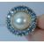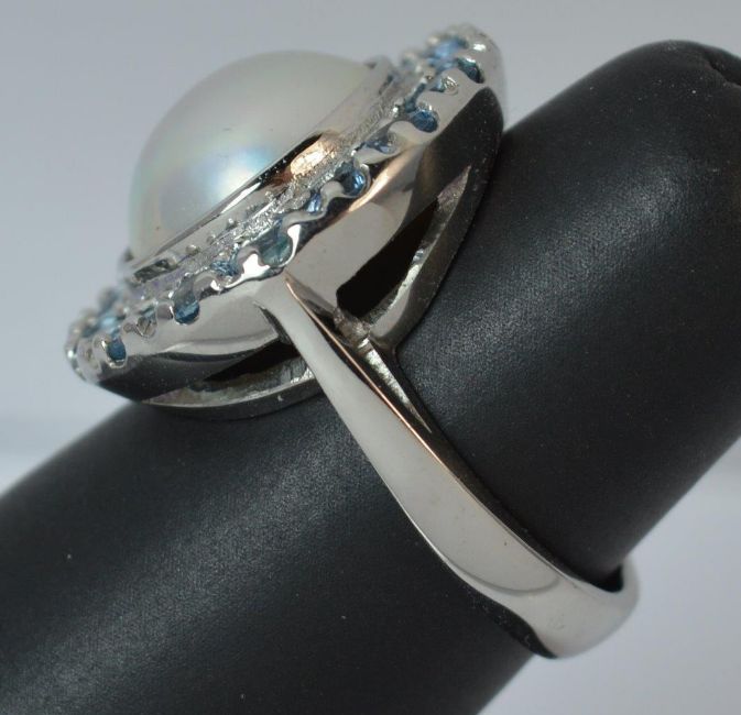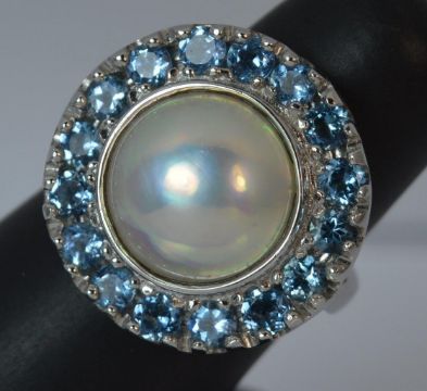 Platinum, Pearl and Aquamarine Cluster Ring, Set with a natural Mabe pearl, 12mm diameter. Surrounding the pearl are sixteen natural aquamarines, 21mm diameter total head, Weight; 16.0 grams, Ring Size; N UK, 6 3/4 US