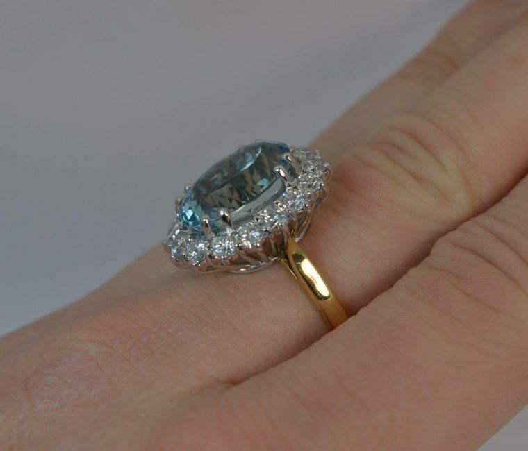 Aquamarine & 1.60ct Diamond 18ct Gold Cluster Ring, Oval cut aquamarine to the centre in an eight claw mount, 10.4mm x 14.8mm approx, Surrounding the aquamarine are 16 natural round brilliant cut diamonds, 16mm x 20mm total cluster, protruding 9mm off the finger. WEIGHT ; 9.6 grams, SIZE ; N UK, 6 3/4 US.