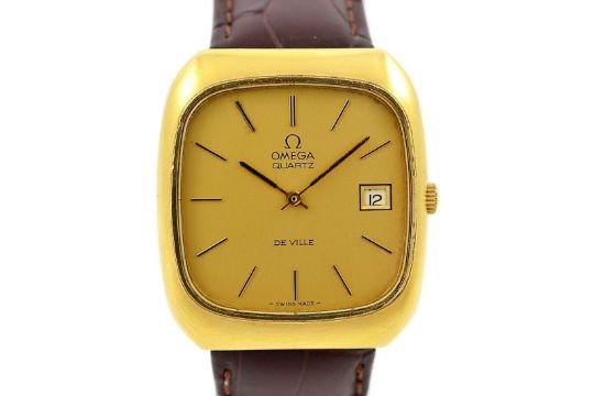 Omega De Ville Quartz Gold Plated Mens Watch, Age: 1970's, Dial: Original Aged Gold Dial, Date Window at 3 o'clock, Mechanism: Quartz Electronic Movement, Cal. 1325. 15 Jewels, Bracelet: Aftermarket New Replacement Genuine Leather Band. Fits 7'' Or 17.5cm Wrist
