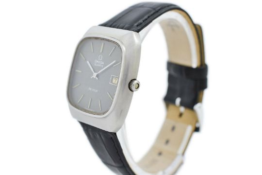 Omega De Ville Stainless Steel Quartz Mens Watch, Age: 1976, Stainless Steel Case Measuring Approximately 33mm X 36mm, Without Crown and from Lug to Lug, Stainless Steel Omega Push Button Crown, Omega 15 Jewels Caliber 1325 Quartz Movement, New Black Darlena Replacement Genuine Leather Bracelet. Fits up to a 20cm or 7.85'' Wrist Approx.