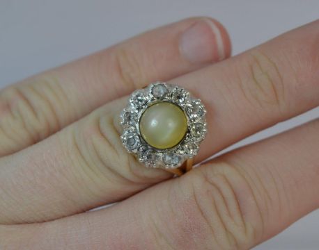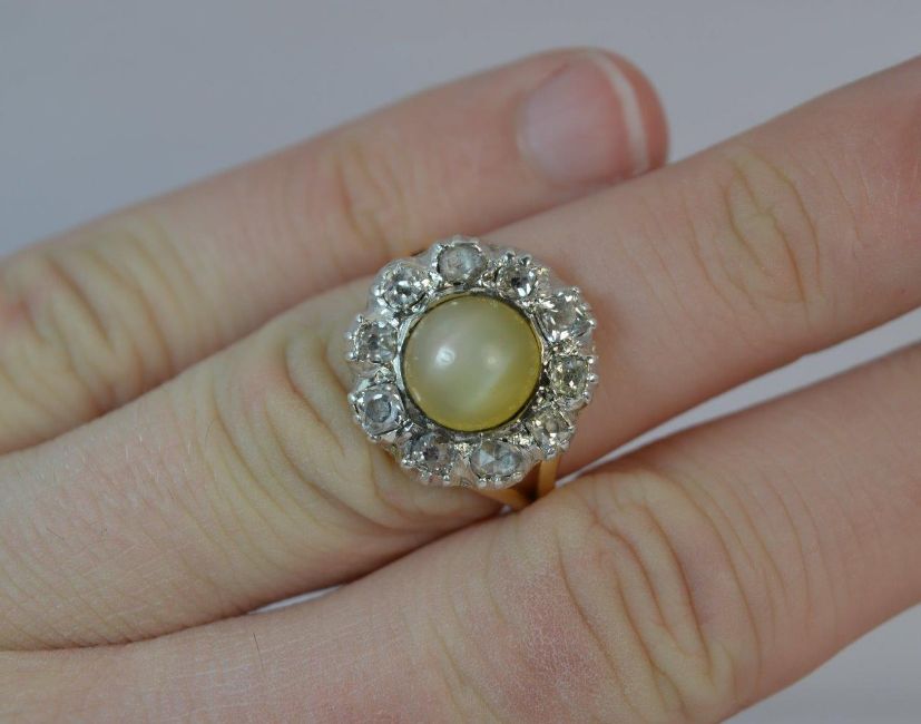 George IV Period Cluster Ring, Solid 15 carat rose gold shank. Designed with a round cat's eye chrysoberyl to the centre, 8mm diameter. Surrounding the stone are ten natural old and rose cut diamonds all mounted in silver, The closed back is engraved 'Elizth Abbot, ob 3rd July 1828, at 72, WEIGHT ; 5.9 grams, SIZE ; J UK, 4 3/4 US