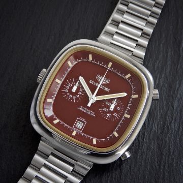 HEUER Silverstone Vintgae 1974 RED Maroon Gloss Dial Watch. There are faint marks in places "swirlies". Faint scuffs and marks to the ORIGINAL NSA HEUER strap however Crystal is A1 MINT Dial is A1 MINT Movement is AS NEW Fully Serviced. Year of Manufacture: 1970-1979