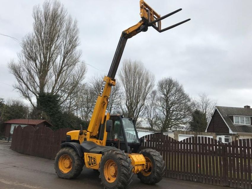 LOT WITHDRAWN | JCB 526-55 TURBO FARM SPECIAL TELEHANDLER ( YEAR 2005 ), FORWARDS AND REVERS ELECTRIC SHUTTLE, FULL CAB, MANUAL GEAR BOX, TURBO ENGINE, 2 WHEEL / 4 WHEEL / CRAB STEER, 4WD, PIPPED, PICK UP HITCH, PALLET TINES, ROAD REGISTERED ( 2005 PLATE ), YEAR 2005, READING 5084 HOURS