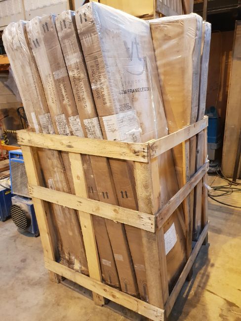 BOW SLIDER DOOR 1200mm / Bright Silver Frame / Clear Glass ( pictures for illustration purposes) SCREEN ONLY . New un used still on pallet