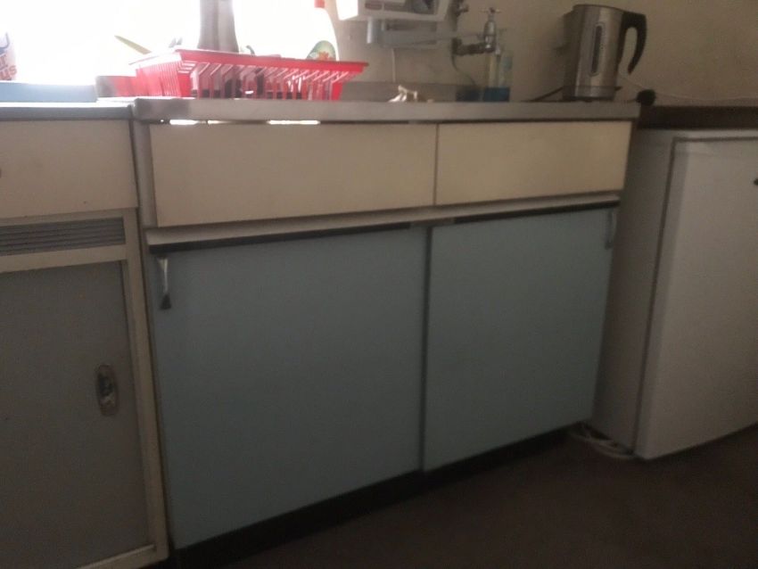 1950s Vintage Retro Kitchen Units Free Standing Light Blue Cream. Beauty 1950s kitchen units available. Two units, one unit with shelf and two drawers, one sink unit with shelf.