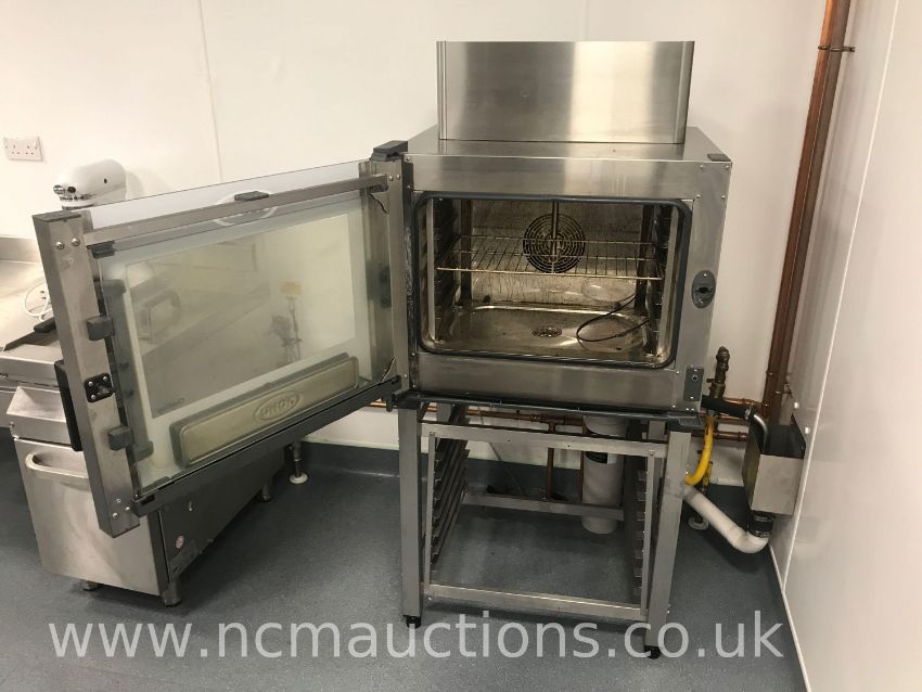 UNOX 5 Grid Gas Combination Oven Multiple Fans Rapid Extraction Steam Cleaning System. Approx Height: 1.475m, Length: 0.823m, Width: 0.860m