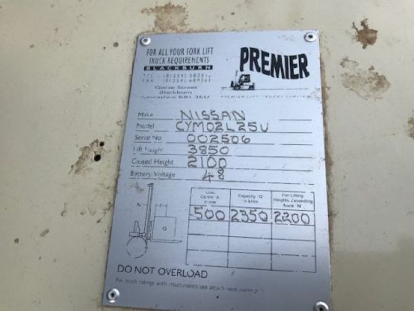 Nissan 2.5 tonne electric forklift model CYM02L25U side shift good charger & good tyres8601hrs