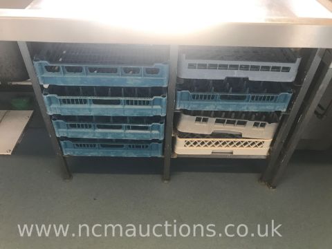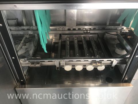 Meiko K200 Pass Through/Conveyor Dishwasher Digital Control Panel Emergency Stop Button 10 Washing Trays Sink with Hose and Drainage Area Approximately H2.069 L 1.112 W 5.347m