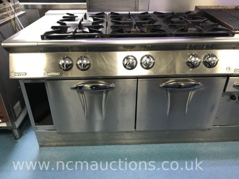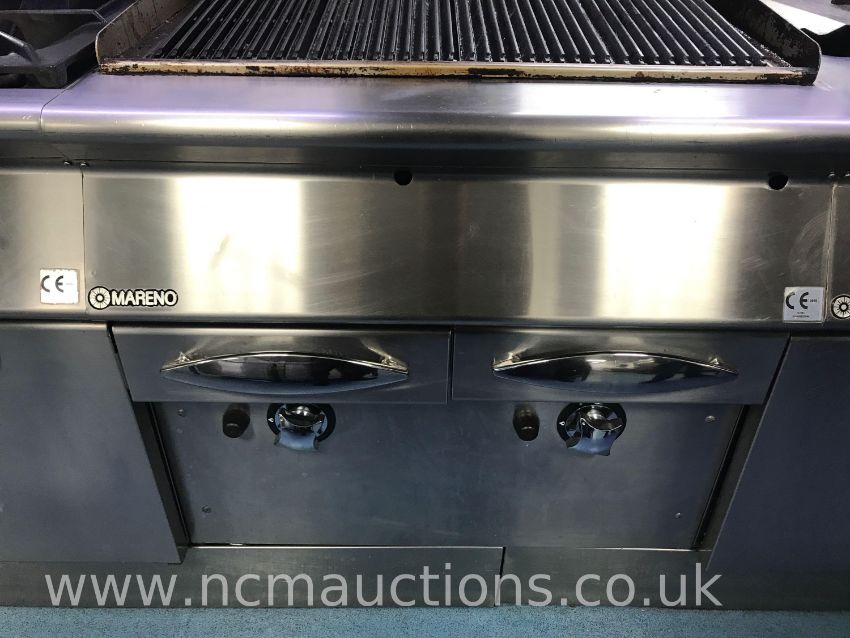 Mareno Restaurant Gas 6 Burner Cook Top Double Door Storage Mareno Restaurant Radiant Gas BBQ Grill With Two Draw Mareno Wide Target Top Oven Range Mareno Double Fryer Storage LP or Natural Gas Approximately H 1.103m L 1.058m W 4.214m