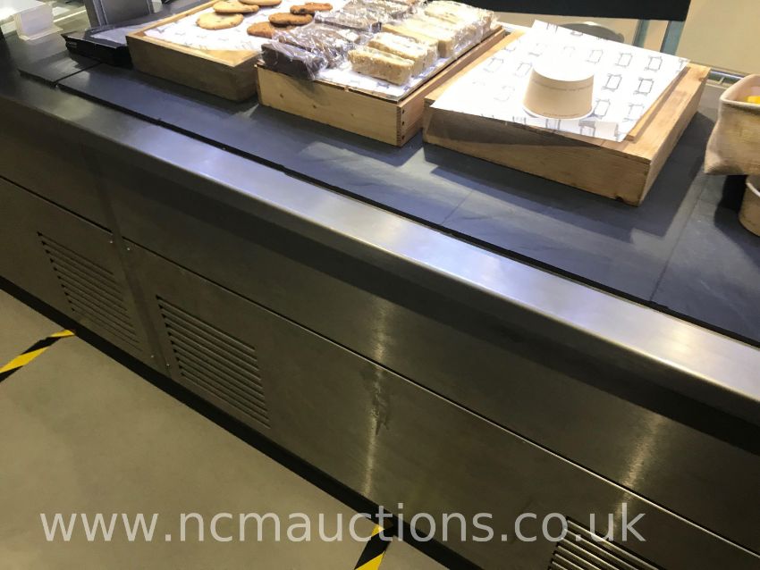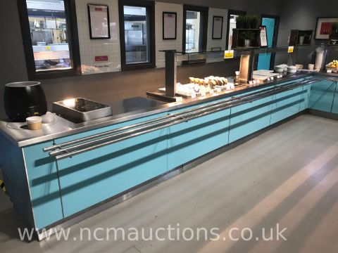 Stainless Steel L-Shaped Serving Counter. x10 Hot Plate Counter, x2 Double Doors, Hot Cupboard, Salad Bar Area, Open Display Refrigerator, Under Storage. Approximate Counter Height 1.021m Glass Top Counter Height 1.547m Display Refrigerator Height 1.831m L 1.231m Width Till To Corner 6.720m Width Corner To Start 6.460m (Food/Stock/Till/Coffee Machine/Any Other Items Not Included)