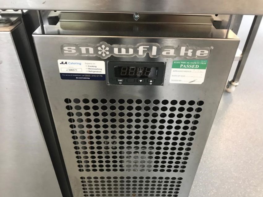 Snowflake Refrigerator. Two Section Self-contained Refrigeration Self-Closing Solid Hinge Doors Wire Shelves Stainless Steel Top Side and Front On Castor Wheels. Approx Height: 0.944m, Length: 0.806m, Width: 1.297m