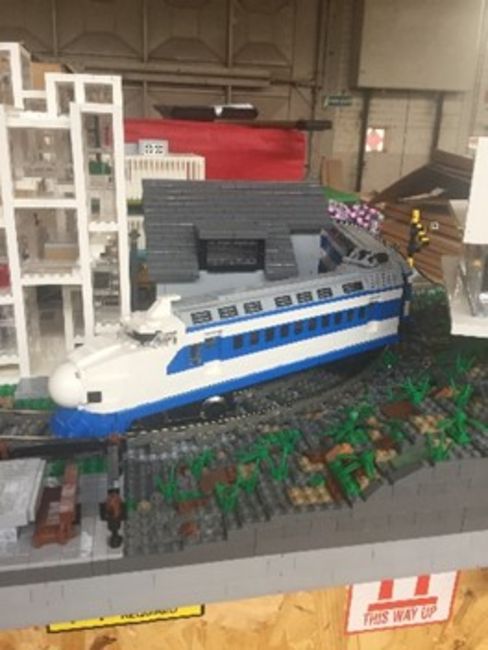The Bullet train is a LEGO model diorama, at minifigure scale, of a Japanese scene including a ‘Shinkansen’ bullet train running on LEGO tracks. The train is motorised and capable of driving around the track. The model comes mounted on a wooden board that has been framed and covered with LEGO. The model is mostly glued.