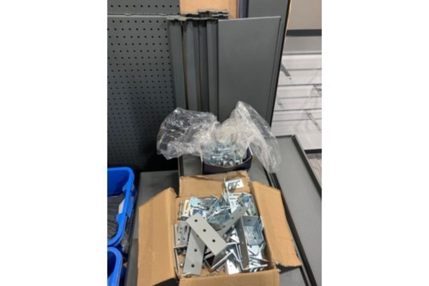 Caem Shop Shelving TN9 System Powder Coated Grigo Ferro Colour 6 Bay Gondola Shop Racking with solid panels, Mid height base with interchangability of components. This lot will include: 40 x Back panels, 10 x Top back panels, 11 x uprighht posts, 11 x Legs with adjustable feet, 20 x Top shelves with head panel, 10 x Kick panels, 50 x Hook bars, 270 x Assorted peg and hook bars ALSO INCLUDED IN THIS LOT ARE THE FOLLOWING COMPONENTS Various interchangeable components. ADDITION TO LOT 19 will include: 73 x 6" Shelves, 12 x 8" Shelves, 1 x left leg cover, 1 x right leg cover, 3 x legs, 3 x 2m posts, 3 x 1m posts, 75 x 1.2m shelf pricing edges, 33x 1m shelf pricing edges, 2 x 1.2m peg panels, 2 x peg and flat 1m panels, 2 x 6" 1.2m shelves, 7 x hook bars 1m, 90 x 12" brackets, 94 x 8" brackets, 52 x 6" brackets plus assorted legs adjusting pins and clips / wall fittings.