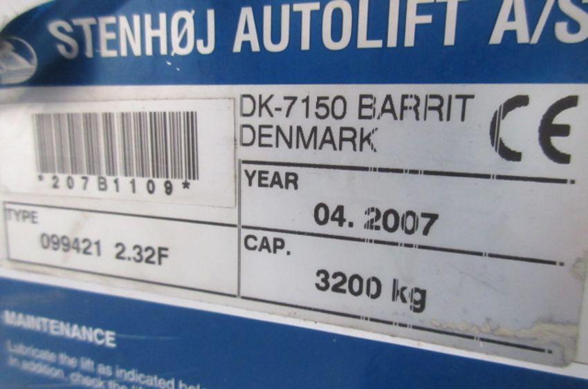 Stenhoj 099421 2.32F 3200kg capacity two post vehicle lift (2007) SN 207B1109. 400V/50hz