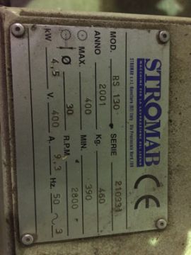 Stromab RS130 Radial Arm Crosscut Saw with return Spring, Cutting width of 1250mm, Year of manufacture 2001, 4.5kw / 6hp, 3 phase 400 volts, 2800rpm, Max blade diameter 400mm, Optional blade diameter 500mm, No of bearings in head 8, Motor speed 2800rpm, Crosscut capacity 1250mm, Crosscut cap at 45 degree 890mm, Blade diameter 400mm, Optional blade diameter 500mm, Max depth of cut (400mm blade) 120mm, Depth of cut at 45 degree 83mm, Weight of machine 460kg, Noise level 84 db(a).