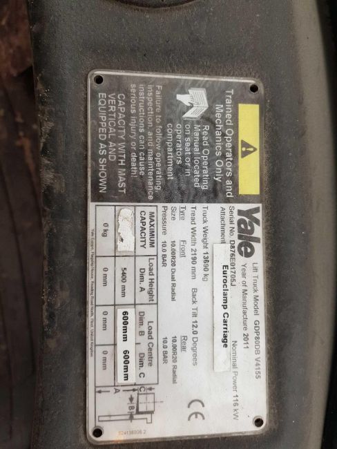 Yale GPD 80 Forklift, Full cab, side shift, fork positioners. Starts, runs and lifts