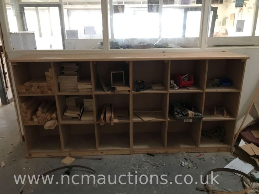 Wooden work table and storage units to include contents (located on 1st floor in the Builders Block)