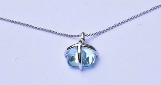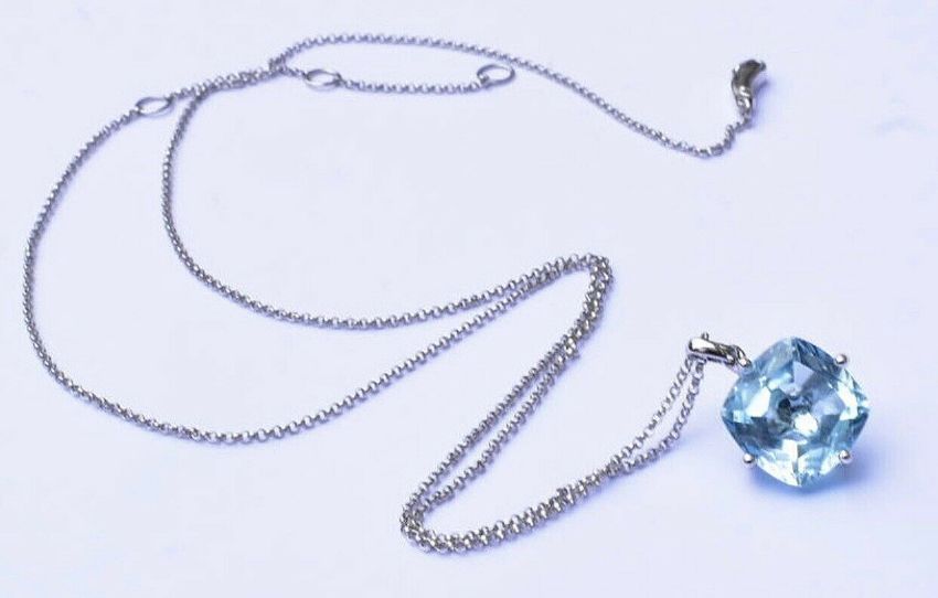 Annoushka Blue Topaz Necklace set in 18k white gold. The necklace features a square-cut blue square topaz of approx 3 carats total set to a white gold chain. Hallmarks: Annoushka,750, Length: 16 inches, Topaz: 3 carats, Weight: 3 grams.