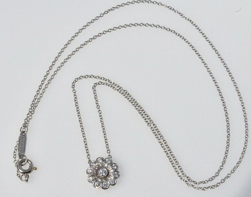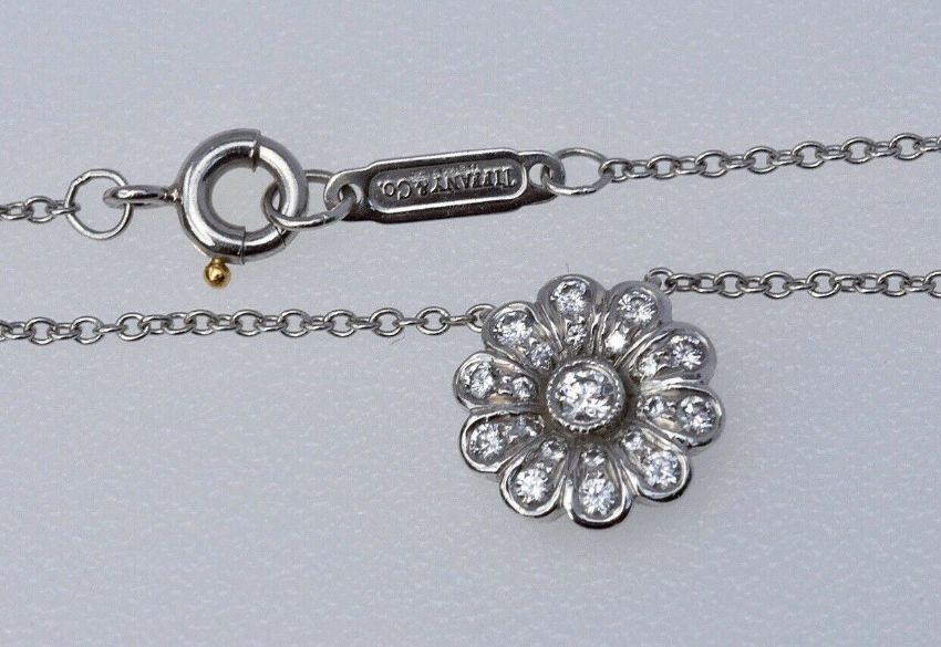 Tiffany & Co Diamond Flower Pendant Necklace set in Platinum. The necklace features a flower head daisy pendant set with round brilliant-cut diamonds of approximately 0.29 carats total suspended from a belcher platinum link chain, 17.5 inches long. Hallmarked: T & Co. P950, with full 2007 Platinum Hallmark, Necklace Measurements: 10mm diameter, Length: 17.5 inches.