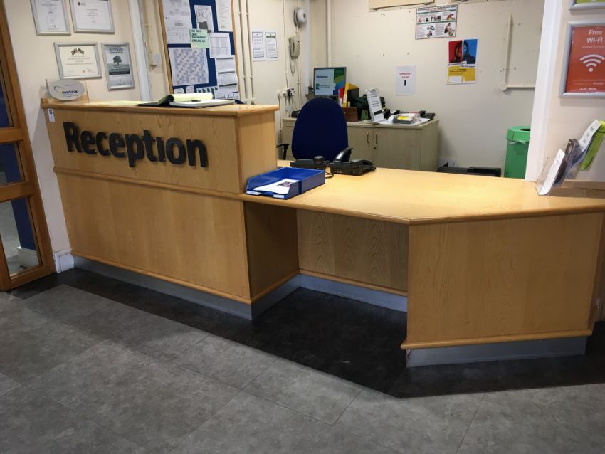 Contents of Reception comprising, 4 piece modular desk, 2 x office chairs, cupboard, pedestal, 2 x computer desks,