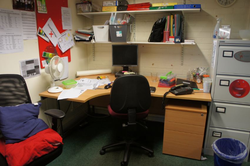 Contents of room comprising, 2 x curve front desk, cantilever frame table, computer desk, side unit, 3 x three drawer pedestals, two drawer pedestal, two drawer filer, four drawer filing cabinet, 4 x gas lift chairs, 2 x desk fans