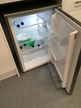 Contents of the staff room comprising, 6 x chairs, coffee table, dinign table, table + 2 x chairs, fridge, microwave, kettle, 2 x fitted sink units