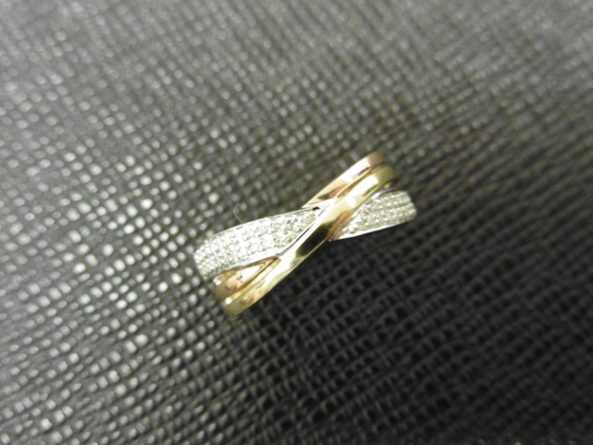 0.14ct diamond crossover band ring set in 9ct gold. Tro coloured gold with a 2 row band of brilliant cut diamonds, H colour and Si clarity. Ring size M. Re-szizing available. Stamped 375