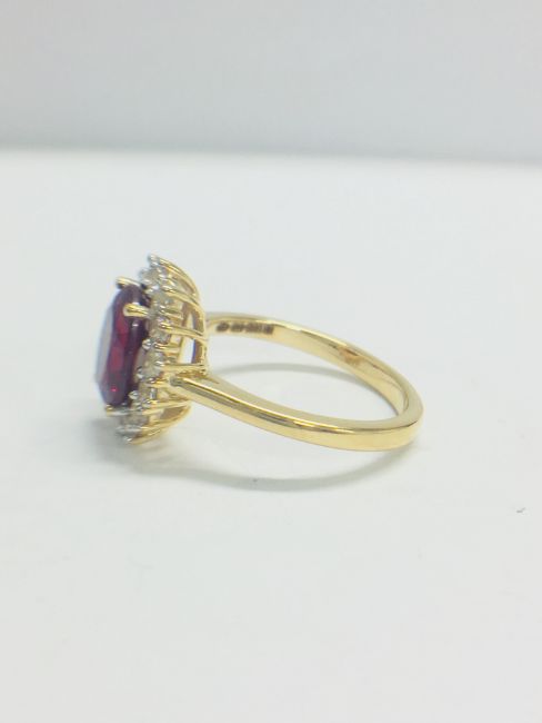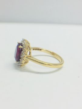 9CT YELLOW GOLD LADIES' RING,OVAL CREATED RUBY,8MMX6MM,WHITE SAPPHIRE SURROUNDING CENTRE STONE,3.50GMS 9CT YELLOW GOLD,UK SIZE L,UK HALLMARK