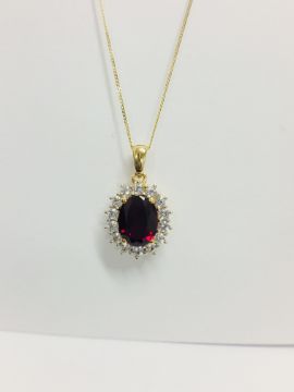 9CT YELLOW GOLD PENDANT,OVAL CREATED SAPPHIRE & WHITE SAPPHIRE,8MMX6MM OVAL SAPPHIRE,WHITE SAPPHIRES SURROUNDING,2GMS 9CT GOLD,9CT 16"CURN NECKLACE ,1GM,UK HALLAMRK,CONDITION FINE